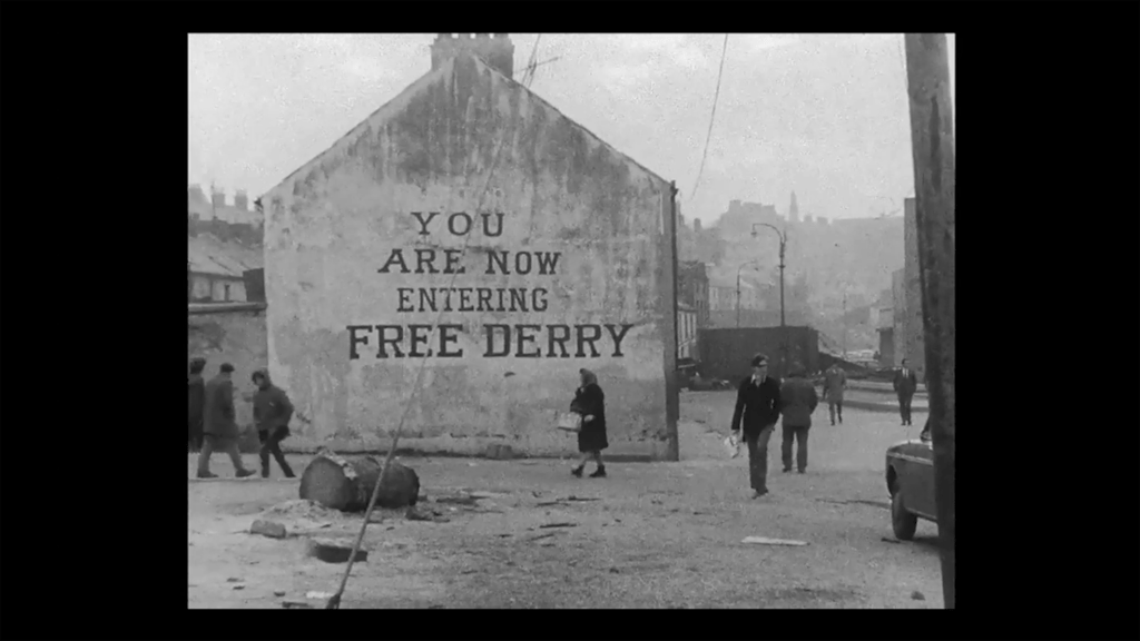 The voice-over sounds like it is shaping a long-form report. The tone is linear, but the narrative is in fragments, and the ending is open. We see and listen to interviews with locals, mainly activists, and scenes from daily life, with children playing and families having lunch or dinner. However, as soon as the camera discloses a wider context, the eye discovers the presence of the British army. It seems to be everywhere, while a series of vibrant protest marches spread out over many towns, from Derry to even London by the end. The film witnesses riots and beatings on the street, violence and death, true stories and social history. Graffiti, ads and protest signs also sometimes pop up as Brecht-like captions. “IRISHMEN DO NOT LIE DOWN UNDER ENGLAND”, “BREAK THE CONNECTION WITH ENGLAND”… The list is long.
