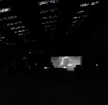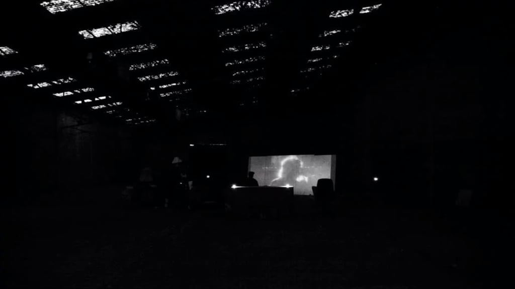 Open Night Cinema took place on Friday June 12th, 2015. It was a very special and intimate evening at a derelict industrial site. The space itself was vast and overwhelming, punctuated with patches of light and a tepid scent of chiselled stone. Watching people enter the complex through the overgrown exterior seemed to be a commingling of imagery from The Niklashausen Journey and Stalker. The atmosphere inside was completely unique and exceeded expectations; even Higgins and Roche somehow offset the fact that we might not leave in one piece. This was the unique flavour of the event, the taste of the unknown and, installed within it, a communal sense of circus, a sort of ‘professional mischief’. There was something quite assertive but also very delicate about the environment, like discovering a large ancient object in the midst of a forest that is about to be felled. Places such as this are home for filmmaker Michael Higgins, who thrives in the debris, a collector of disused and industrial artefacts. With his filmmaking, he connects the discarded to the ancient, or at least his vision of it. Suitably enough, this was a presentation of cinema as a traditional or indigenous ritual, perhaps with respect to some deceased tribe.