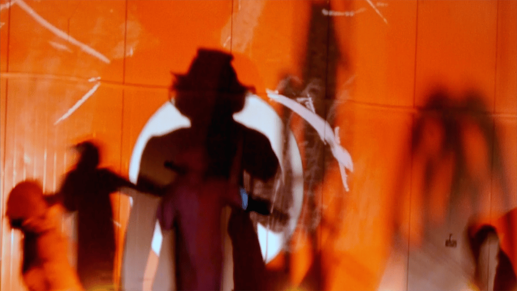 What pre-exists logical thinking, the so-called “event”, or in this case, the “displayed”, is nothing but the evolution, the revealing of anguished stories represented in a chaotic and scatterbrained form, legends that turn that inexplicable arch of time into an instrument of critical analysis of the universe and the laws that govern it. The uninterrupted projection of images, the dynamism of the camera movements, and the makeup and costumes recall indigenous traditions that create a sense of hallucination that, in a way, both constitute it and precede it. Nearly entirely performed through improvisation, it contests the concept of any formal dialectical method (inevitably allowing the form to become the main contextual way of communication). It refuses to declare a specific grammatical expression, and through this denial, it is already an archetype of linguistic evolution. The action and reaction of performers, the light and dark within the space and the resonance produced by the spoken words acquire an awareness of the filmic object.