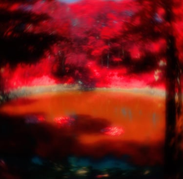 Rashidi transforms the greenery of the landscape into a different set of colourised vistas. Elpis’ synthetic colour palette is dominated by reds, oranges, crimsons, magentas – those are the colours of war, blood, flames, sunsets, burnout, apocalypse. Perhaps it is time that Mars – the God of War, the Red Planet – finds its own renewal from within. Perhaps it is time to soak in the infra-red radiation of rage, in the sulphuric acid of our own juices, so that a new hope can emerge from the depths. This is a novel invocation of Elpis, the Spirit of Hope. Hope from the smouldering ruin of the Sublime.